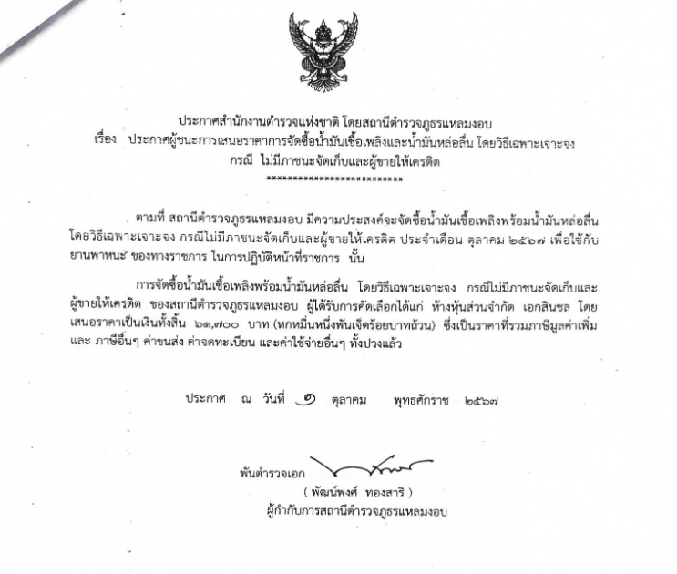 ประกาศจัดซื้อจัดจ้าง ต.ค.67 1 ตุลาคม 2567 โดย admin / ประกาศจัดซื้อจัดจ้าง สถานีตำรวจภูธรแหลมงอบ มีความประสงค์จะจัด ซื้อน้ำมันเชื้อเพลิงพร้อมน้ำมันหล่อลื่น โดยวิธีเฉพาะเจาะจง กรณีไม่มีภาชนะจัดเก็บและผู้ขายให้เครดิต ประจำเดือน ตุลาคม 2567 เพื่อใช้กับยานพาหนะของทางราชการในการปฏิบัติหน้าที่ราชการ ประกาศจัดซื้อนำมันเชื้อเพลิง เดือน ต.ค.67 (ดาวน์โหลดที่นี่ 1 )